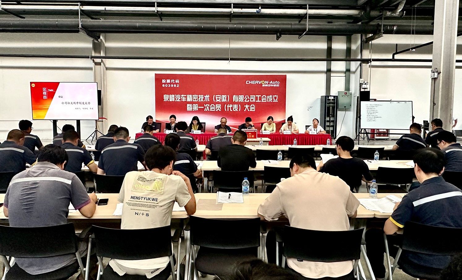 On the afternoon of August 11, 2023, the establishment of the trade union and the first member (representative) conference of Chervon Auto Precision Technology (Anhui) Co., Ltd. was successfully held in the machine workshop of the Maanshan plant, and 48 employee representatives and 17 non-voting representatives from various lines of the company attended the meeting. In accordance with legal procedures, the General Assembly adopted secret ballot and elected members of the first committee of Chervon Auto (Anhui) Trade Union, members of the Fund Review Committee and members of the female workers Committee. The first plenary meeting of the newly elected "Three Committees" Committee of the first trade union elected Zhang Chuang as the chairman of the trade union, Han Peixin as the director of the Fund Review Committee, and Zhao Wanling as the director of the female staff Committee.Elected the first committee chairman of the company's trade union Zhang Chuang made a statement, in the future work, the trade union will closely focus on the overall situation of the company's strategic development, effectively enhance the sense of responsibility, take the lead in the grassroots, in-depth workers, listen to the voice of workers, care about workers, and strive to solve the problems for the workers; To further stimulate the enthusiasm and energy of the broad masses of workers in relation to enterprises, supporting enterprises and developing enterprises, the rapid development of Chervon Auto provides inexhaustible spiritual motivation and solid guarantee. At the meeting, the company's deputy general manager Li Jiangnan expressed warm congratulations to the establishment of the conference and made an important speech. It is hoped that the newly elected members of the trade union will bear in mind the purpose of the trade union organization, listen to the demands of the employees, closely focus on the production and operation of the company, effectively realize, safeguard and develop the legitimate rights and interests of the majority of trade union members, mobilize, give full play to and protect the enthusiasm and creativity of the majority of members and employees, Unite and mobilize all members to play the role of the main force with a high sense of responsibility in the construction of the unit, and live up to the trust and expectations of all trade union members and employees on the trade union committee. The meeting heard the "Trade union Preparation and representative qualification Examination Report", Deliberated and passed the "General Assembly election Measures", "Committee Implementation replacement system resolution" and "Employee entry and probation management Measures", "Attendance management system", "Salary and welfare management system", "salary payment management Measures", "welfare management Measures", "labor contract management Measures", "Performance appraisal management System", "Divestment management Measures", "Employee labor discipline Management Measures ", "Code of Ethics" ten rules and regulations.